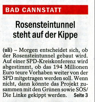 (Anmerkung zum Artikel: Die SPD-Bad Cannstatt bekennt sich nach wie vor FÜR den Bau des Rosensteintunnels!)