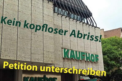 Aufgrund von Nachfragen eine Klarstellung: Wir sind NICHT gegen den Abriss als solches, sondern möchten nur verhindern, dass das Kaufhof-Gebäude abgerissen wird und jahrelang eine Baubrache an dieser Stelle entsteht.